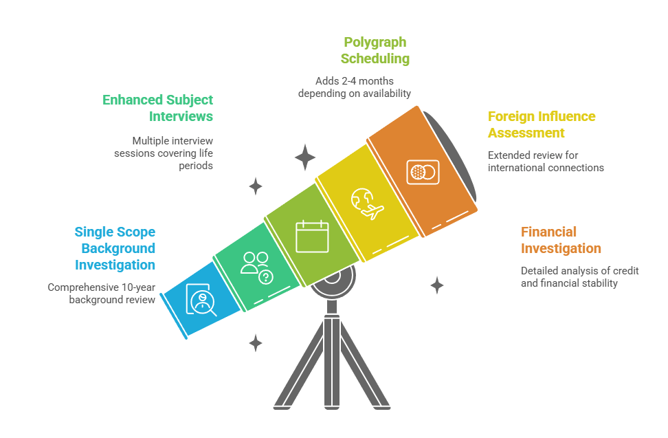 - Polygraph scheduling: Adds 2-4 months depending on examiner availability and geographic location