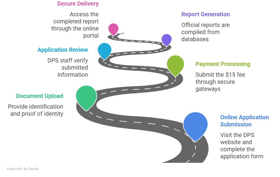 - Processing times vary significantly from instant online reports to 5-7 business days for official DPS records.
