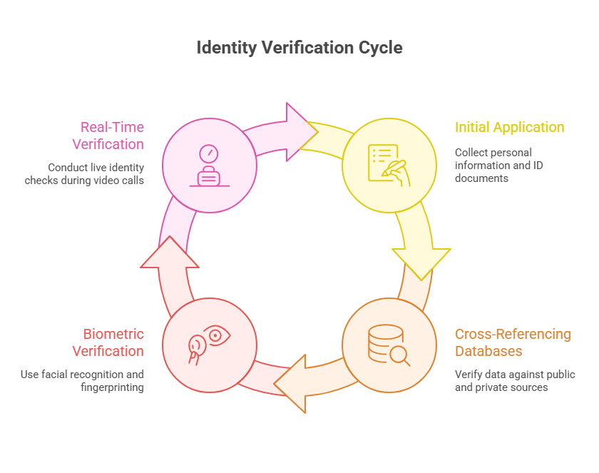 - The process involves verifying government-issued IDs, cross-referencing external databases, and utilizing biometric verification for additional security.