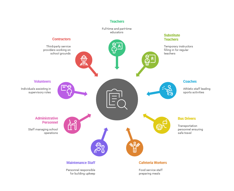 This comprehensive coverage expands compliance obligations beyond direct employees. Educational institutions must track background check status for all individuals with potential student contact. Recent enforcement actions have targeted schools that failed to properly screen contractors and volunteers.