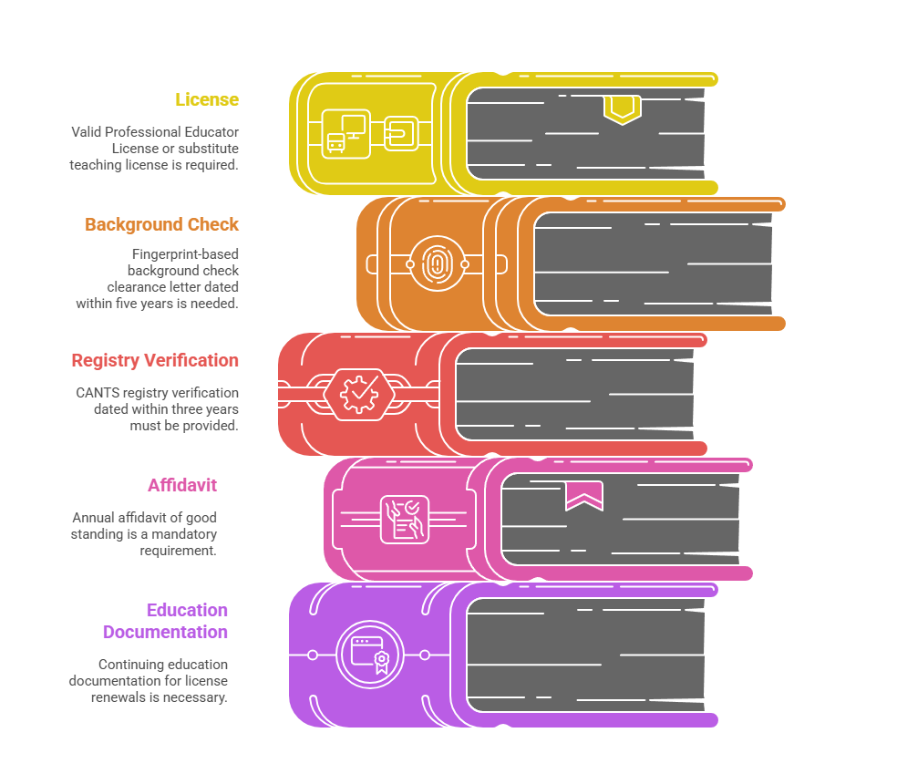Substitute teachers must complete the same multi-step verification process as full-time staff. This includes fingerprint-based FBI and state criminal history searches. Additionally, substitutes require CANTS registry verification and sex offender database checks. The process typically takes four to six weeks to complete. This timeline creates planning challenges for districts managing substitute pools.