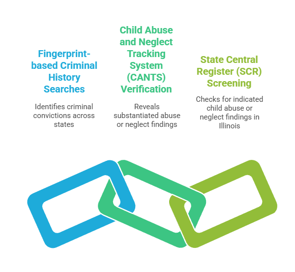 - State Central Register (SCR) screening: System checks for indicated child abuse or neglect findings from investigations occurring in Illinois. This overlaps with CANTS but captures additional historical data. Processing typically takes three to five business days.