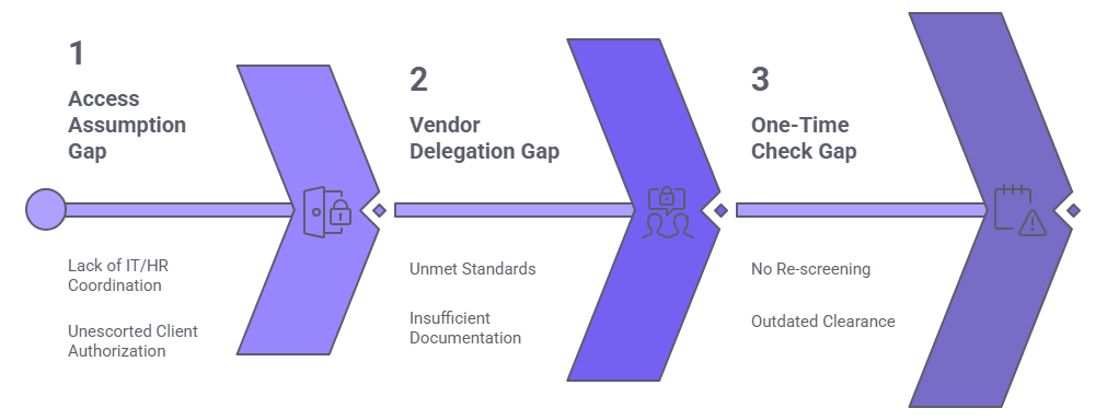 - The three most common contractor screening gaps are the access assumption, the vendor delegation assumption, and the one-time check assumption. Each is a structural program design failure, not an oversight.