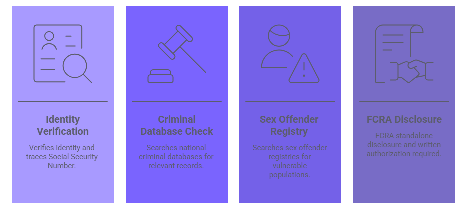 The screening stack should match the contractor's access profile. Contractors with any facility, system, or client access need identity verification, a national criminal check, and FCRA-compliant disclosure and authorization. Elevated access roles add multi-jurisdiction county records, engagement verification, and professional license verification where applicable.