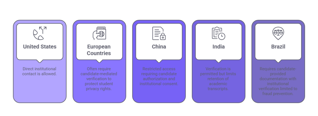 - European countries: Often require candidate-mediated verification to protect student privacy rights