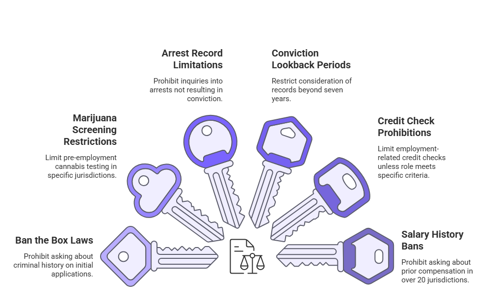 - Ban the Box laws: Prohibit asking about criminal history on initial applications in numerous states and municipalities