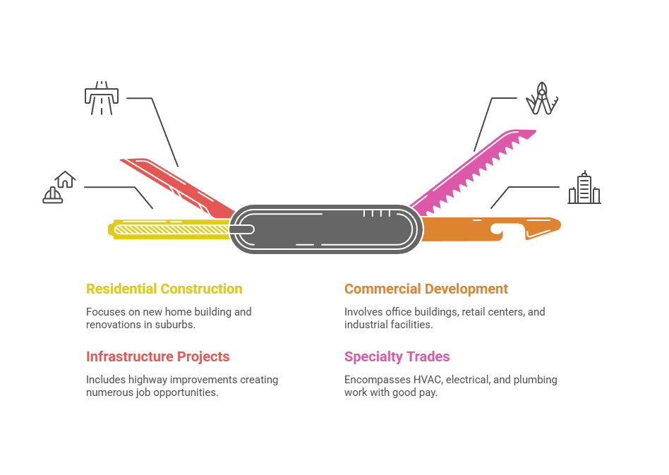 - Infrastructure projects: State and federal highway improvements creating thousands of positions