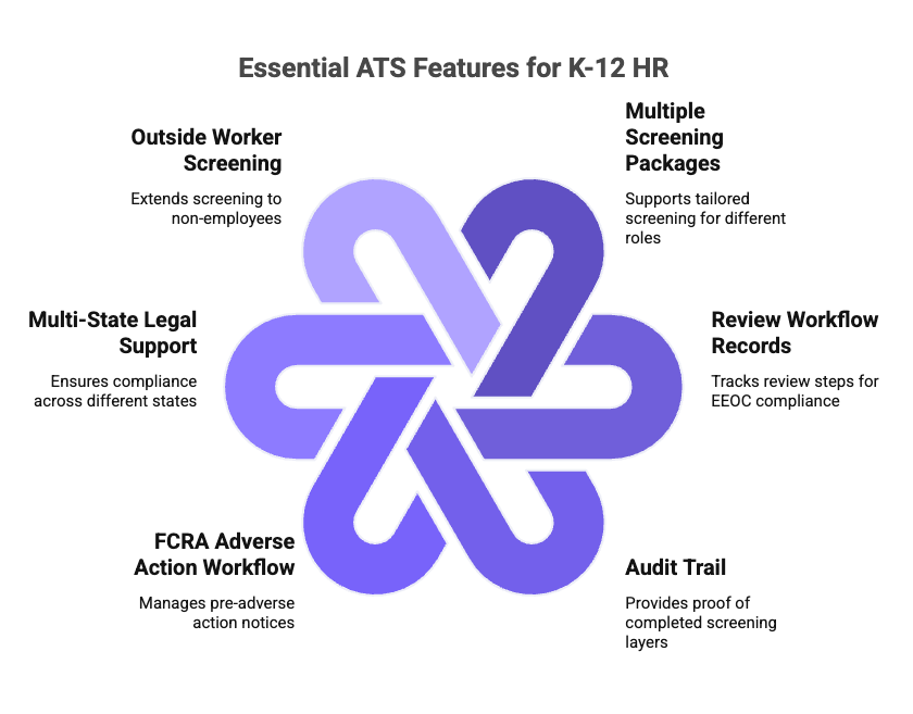 - FCRA adverse action workflow. If the school uses a consumer reporting agency, the ATS must support the pre-adverse action notice and waiting period process.