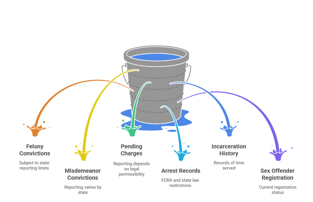 - Arrest Records: Arrests not resulting in conviction may appear in some states, subject to FCRA and state law restrictions.
