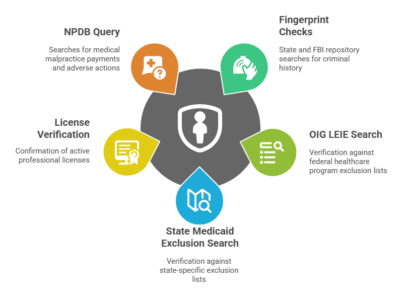 Healthcare organizations face comprehensive screening mandates. The Centers for Medicare and Medicaid Services (CMS) require facilities to search the LEIE, National Practitioner Data Bank (NPDB), and state Medicaid exclusion lists. Many states add fingerprint-based criminal checks for clinical staff, administrators, and individuals with patient or controlled substance access.