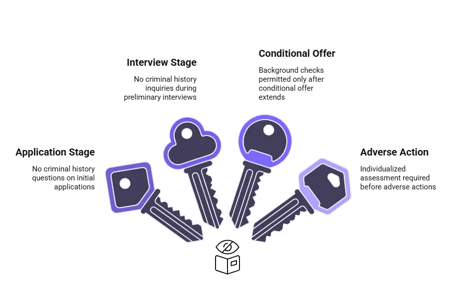 This layered structure creates complexity for employers who must identify which rules apply based on hiring location, position type, and record characteristics. The framework does not prohibit background checks entirely but instead regulates timing, permissible inquiries, and decision-making processes.
