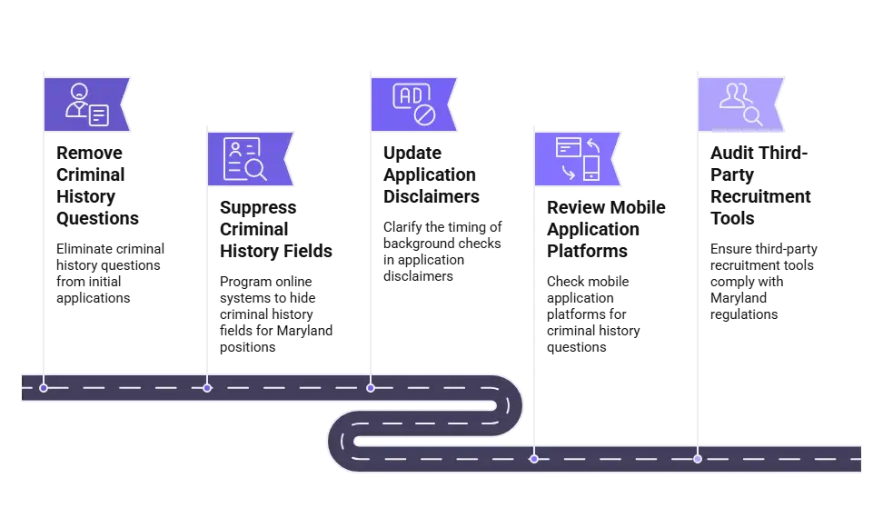 Employers should audit all employment applications, online application systems, and preliminary screening forms to remove criminal history questions for Maryland positions covered by ban-the-box requirements.