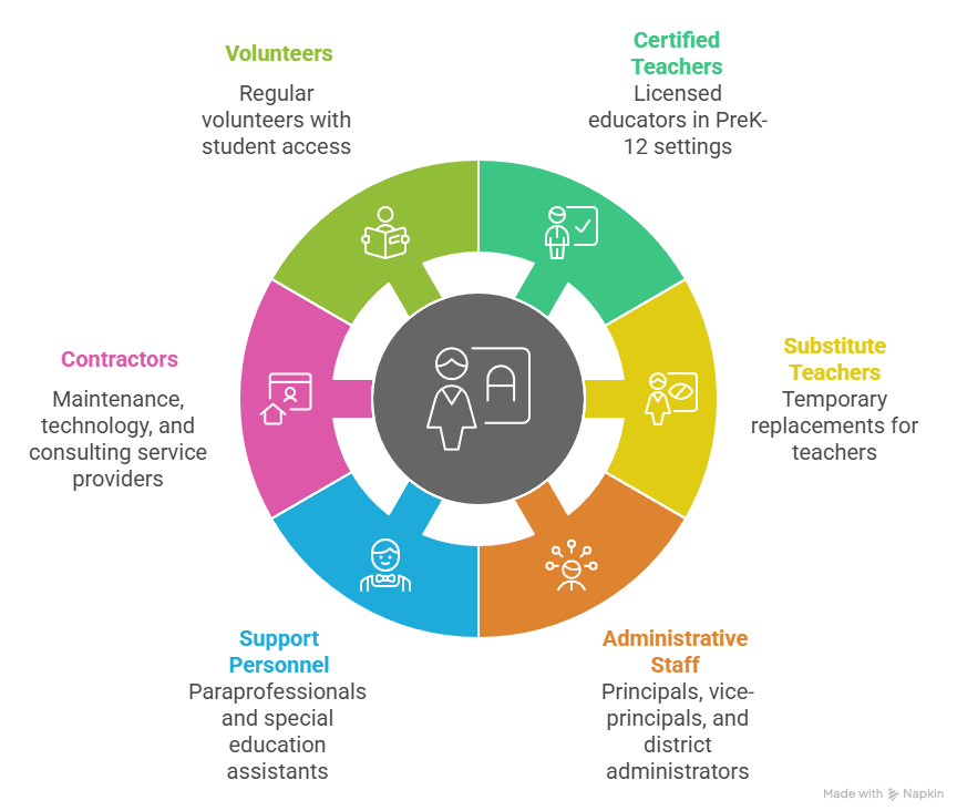 The scope includes both direct and indirect student contact roles, recognizing that school safety depends on comprehensive vetting of all personnel. Bus drivers, cafeteria workers, maintenance staff, and after-school program coordinators must undergo identical screening processes. This broad application ensures consistent safety standards across all school operations and eliminates potential security gaps.