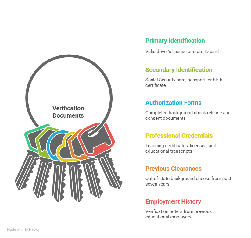 Required documents include government-issued photo ID, Social Security verification, completed authorization forms, teaching certificates, educational transcripts, and any previous state clearances from the past seven years. Out-of-state applicants must provide clearances from all previous residence states.