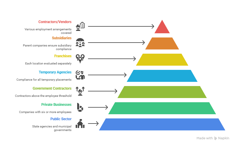 - Public sector employers: State agencies, municipal governments, and school districts regardless of size