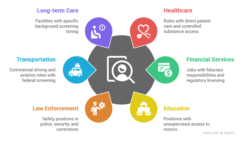 - Financial services: Jobs requiring bonding, fiduciary responsibilities, or regulatory licensing