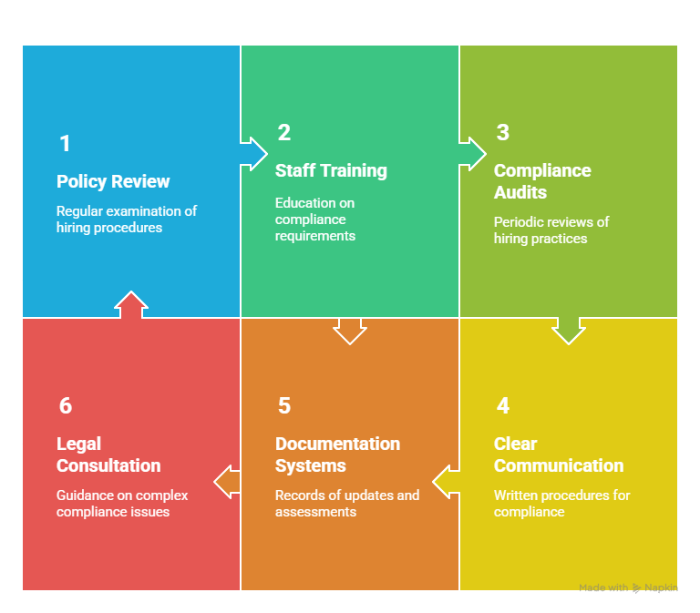 Ongoing compliance requires regular policy reviews and updates. Staff training must be updated as regulations evolve. Employers should monitor legal changes that might affect their hiring practices.