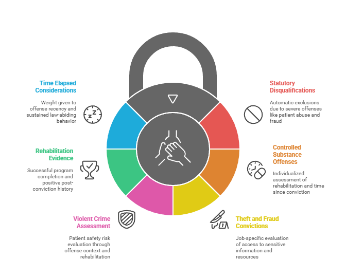 - Statutory disqualifications: Patient abuse, sexual offenses against vulnerable persons, healthcare fraud, and violent crimes against protected populations creating automatic employment exclusions