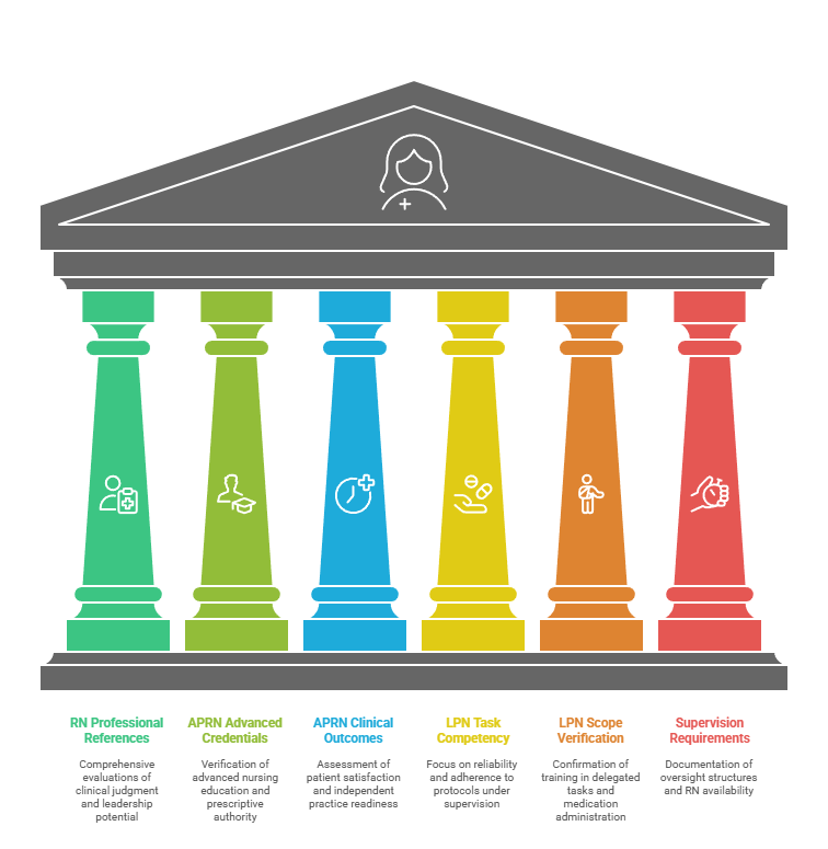 - APRN advanced credentials: Graduate nursing education verification, specialty certification board status, DEA registration for prescriptive authority, and collaborative practice agreements