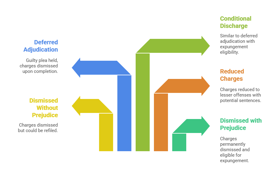 • Conditional Discharge: Similar to deferred adjudication with completion resulting in dismissal and potential expungement eligibility.