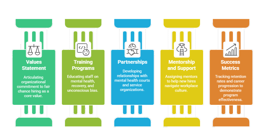 Developing an inclusive hiring strategy requires intentional policy design and leadership support. Fair chance hiring represents a values-driven approach that may face initial resistance from risk-averse managers or staff with misconceptions about mental health court participants. Education about therapeutic courts and their success rates helps overcome resistance and build organizational confidence.