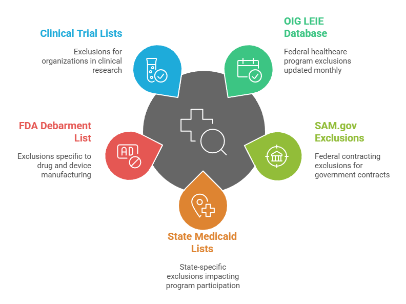 - State Medicaid Lists: State-specific exclusions that may not appear in federal databases but impact state program participation significantly.