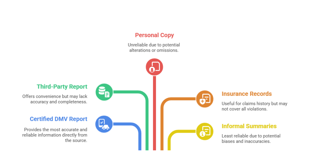 • Employers subject to Department of Transportation (DOT) regulations must obtain certified MVRs for driver positions, as uncertified driving history summaries typically don't meet federal compliance requirements.