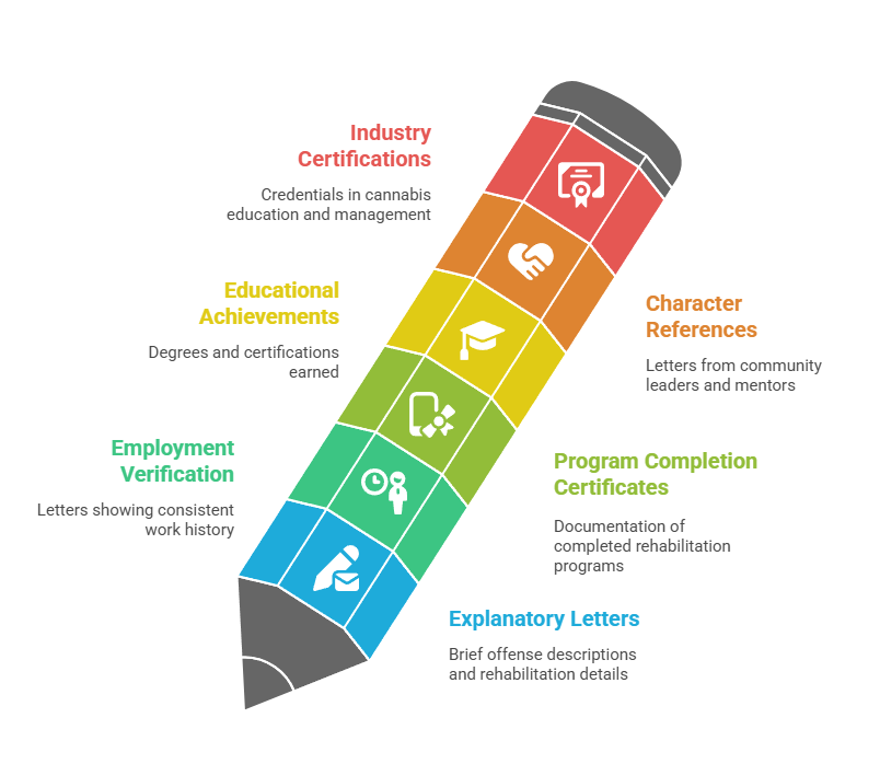 • Explanatory letters: Brief offense descriptions, responsibility acceptance, rehabilitation details, and trustworthiness demonstrations
