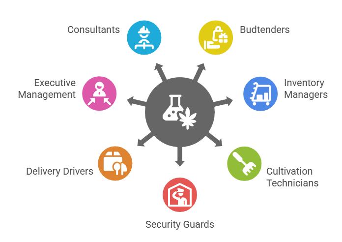 • Consultants with facility access: Third-party professionals who regularly enter restricted cannabis areas