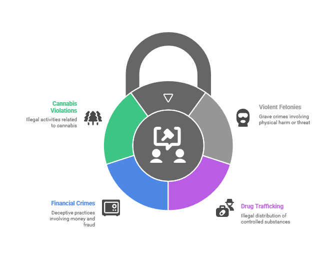 • Drug trafficking convictions: Intent to distribute controlled substances outside legal frameworks or operating unlicensed cannabis operations