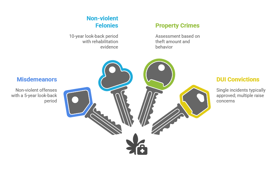 • DUI convictions: Single incidents from several years ago typically approved; multiple or recent DUIs raise concerns