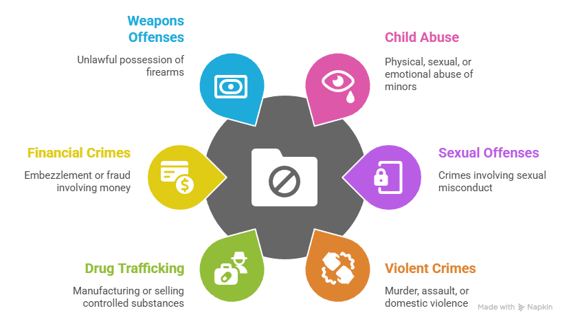 - Violent crimes: Murder, manslaughter, aggravated assault, or domestic violence convictions