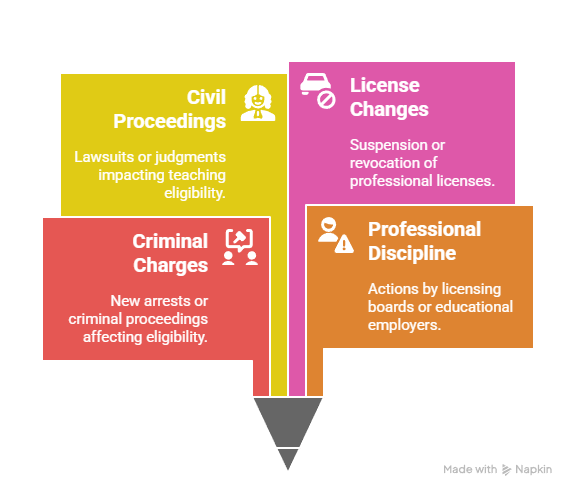 - Civil proceedings: Lawsuits or judgments that might affect teaching eligibility