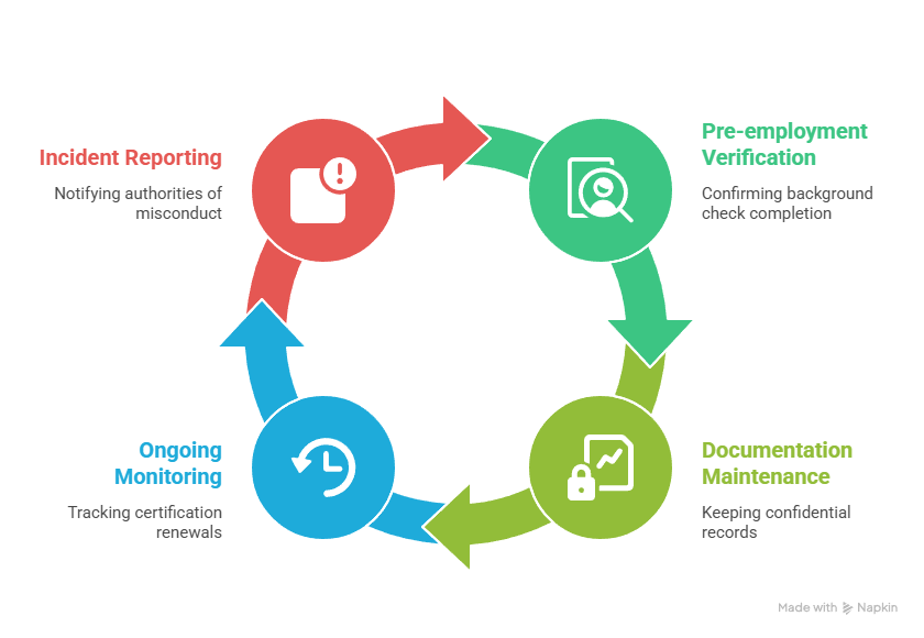 New Jersey school districts bear significant responsibilities for ensuring proper background screening compliance. Districts must verify that all employees have completed required checks before beginning work. Appropriate documentation of compliance must be maintained throughout the employment relationship. Ongoing monitoring of employee eligibility is also required.