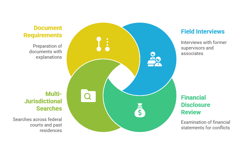 Comprehensive investigation including financial disclosure, field interviews, multi-jurisdictional searches