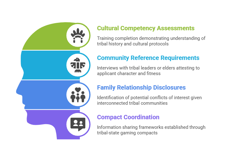 Tribal gaming commissions exercise independent regulatory authority comparable to state gaming control boards. They frequently implement culturally-specific screening criteria. These may include tribal court record reviews, assessments of cultural respect for tribal traditions, and consideration of family relationships within tribal governance structures. The legal complexity of Indian gaming law—involving intersections of federal Indian law, gaming regulations, and state compact provisions—typically requires consultation with attorneys specializing in tribal gaming matters.