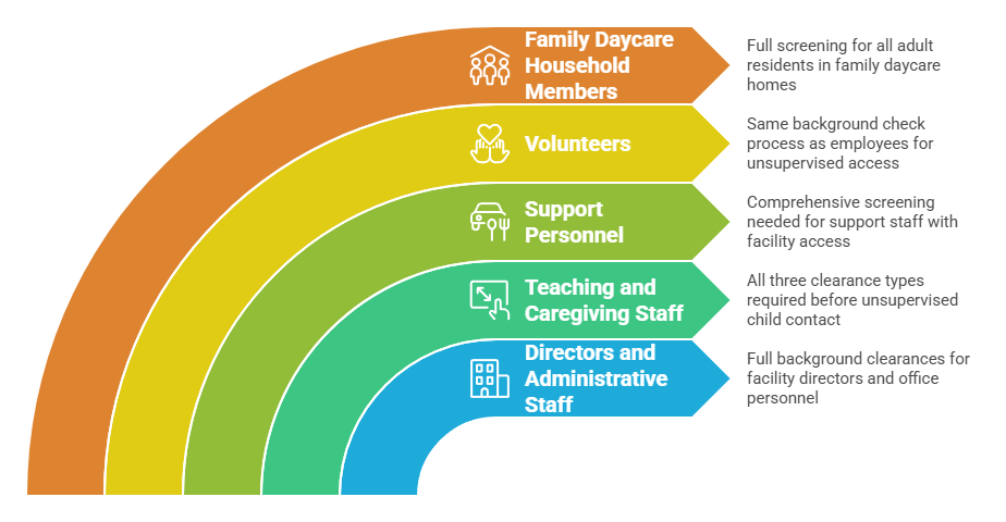 - Directors and administrative staff: All facility directors, assistant directors, and office personnel with regular building access require full background clearances regardless of whether they provide direct childcare services.
