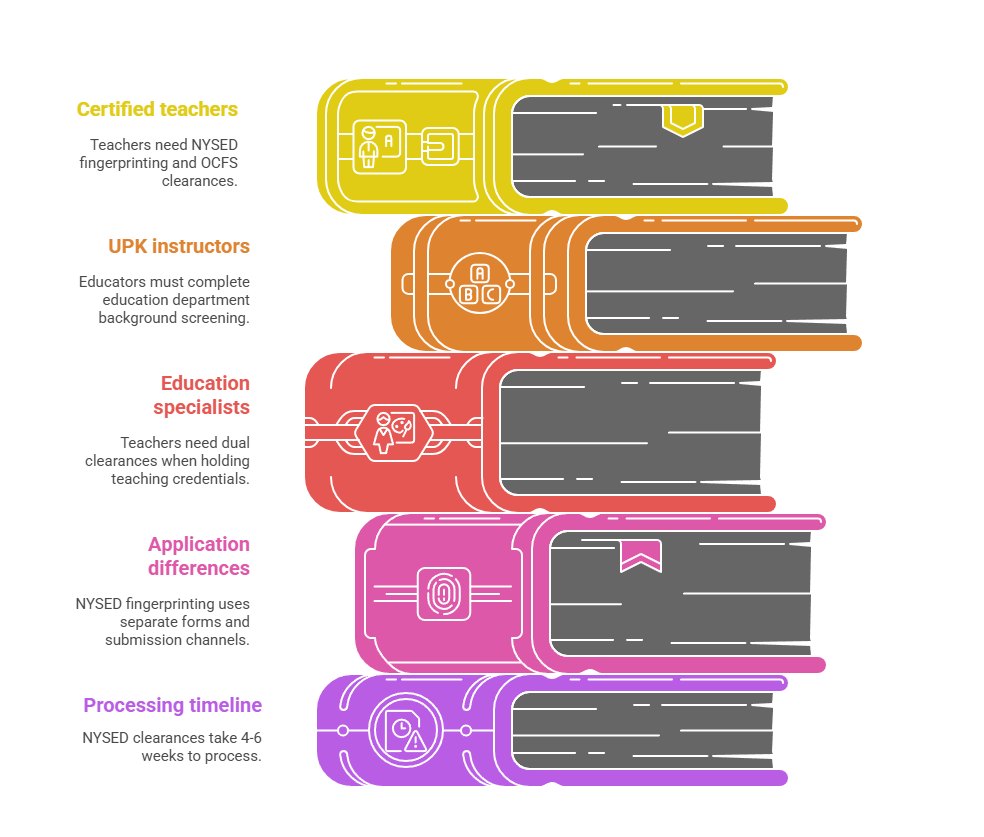 Teachers working in New York daycare centers who provide educational instruction may require additional background screening through the New York State Education Department. These education-related clearances are separate from OCFS childcare background checks. They serve different regulatory purposes tied to teaching credentials rather than childcare facility licensing.