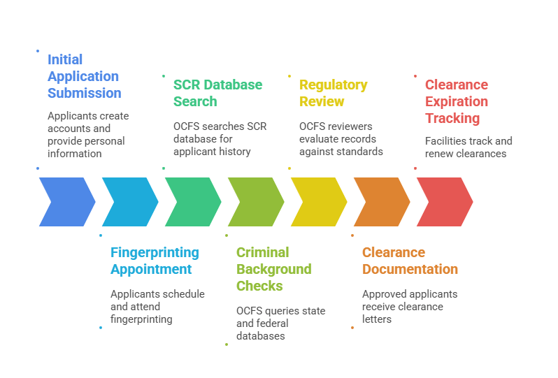 Once OCFS receives complete applications and fingerprints, multiple review stages begin simultaneously. The SCR database search runs first, typically completing within 48-72 hours for applicants with no history. Criminal background checks query state and federal databases. Results flow back to OCFS for evaluation against disqualifying offense criteria.