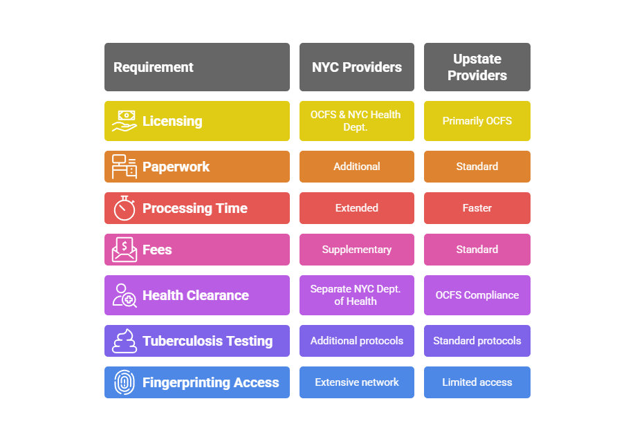 NYC facilities must satisfy both OCFS requirements and NYC Department of Health and Mental Hygiene regulations, creating additional paperwork and processing time. Upstate providers work exclusively with OCFS regional offices, typically experiencing faster processing. However, core clearance requirements—SCR, criminal history, and sex offender registry checks—remain the same statewide.