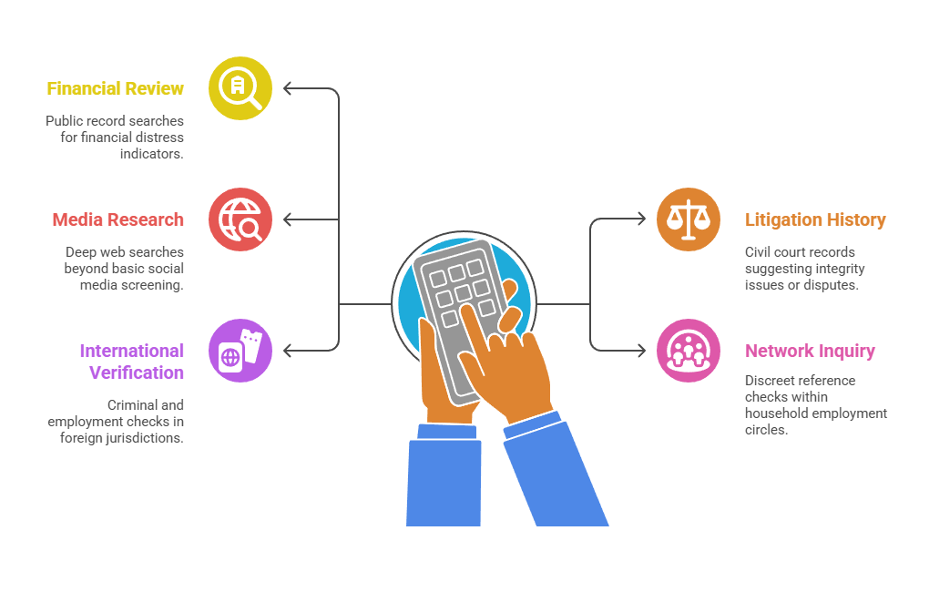 High-net-worth families face unique security considerations that justify enhanced verification. Enhanced due diligence combines traditional background checks with investigative research techniques. These comprehensive processes help identify risks that standard screening might miss.