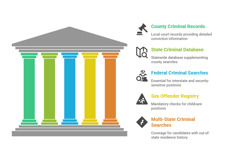 - Federal criminal searches: Essential for candidates with interstate residence history or enhanced security positions