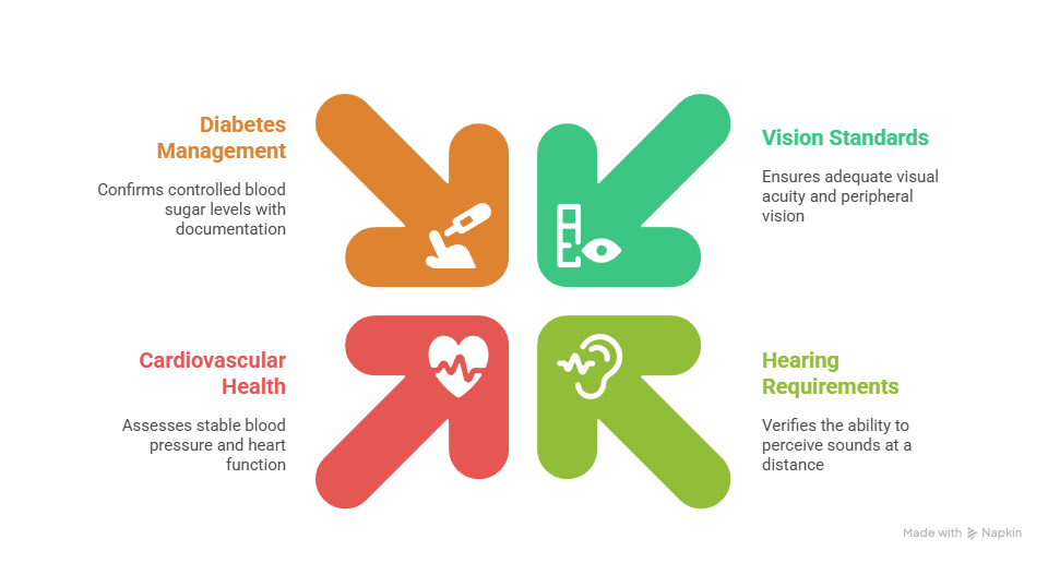 Medical disqualifications include uncorrected vision worse than 20/40, hearing impairments preventing whisper perception at five feet, uncontrolled diabetes, blood pressure above 180/110, and certain cardiovascular conditions. However, many conditions can be managed with proper medical care and physician documentation to maintain certification eligibility.