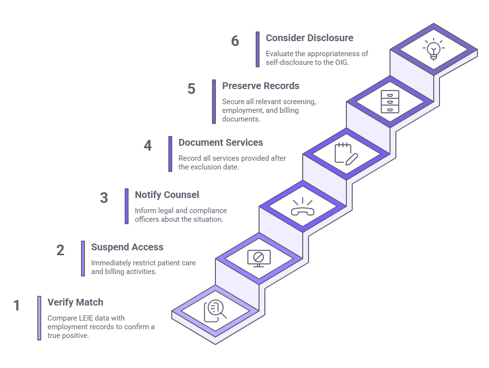 Finding a potential LEIE match requires an immediate, structured response. The following protocol describes the steps compliance teams should follow upon identifying a potential exclusion match.