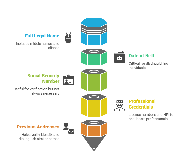 At minimum, collect the candidate's full legal name, including middle names and any former names or aliases used. Also collect date of birth. Social Security Numbers are helpful for verification but not always necessary for the initial search. They become important if potential matches are identified. Professional license numbers and National Provider Identifiers (NPIs) provide additional verification points for licensed healthcare professionals.