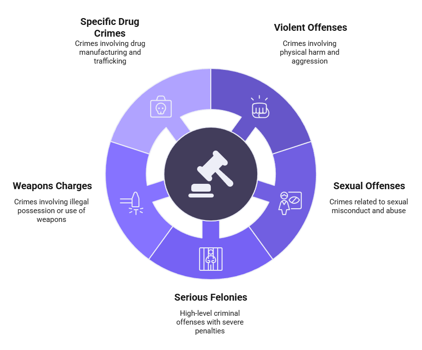 - Specific drug crimes: Manufacturing and trafficking charges above certain thresholds