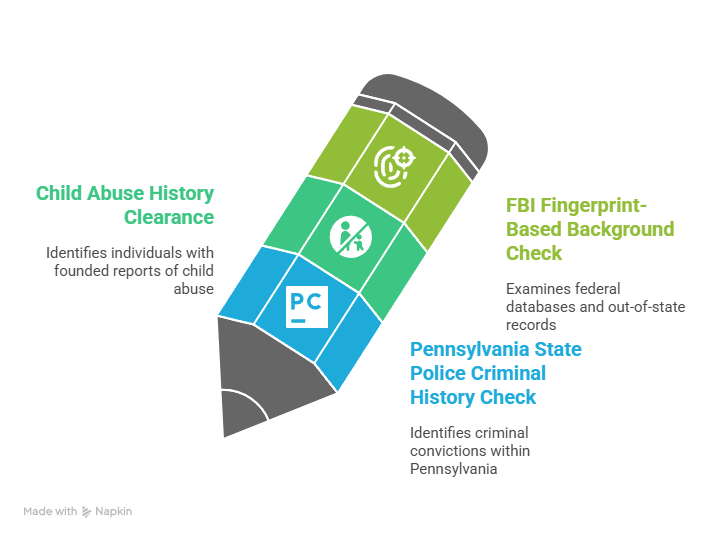 - Pennsylvania requires three separate background clearances for daycare workers: Pennsylvania State Police Criminal History, Pennsylvania Child Abuse History, and FBI fingerprint-based checks