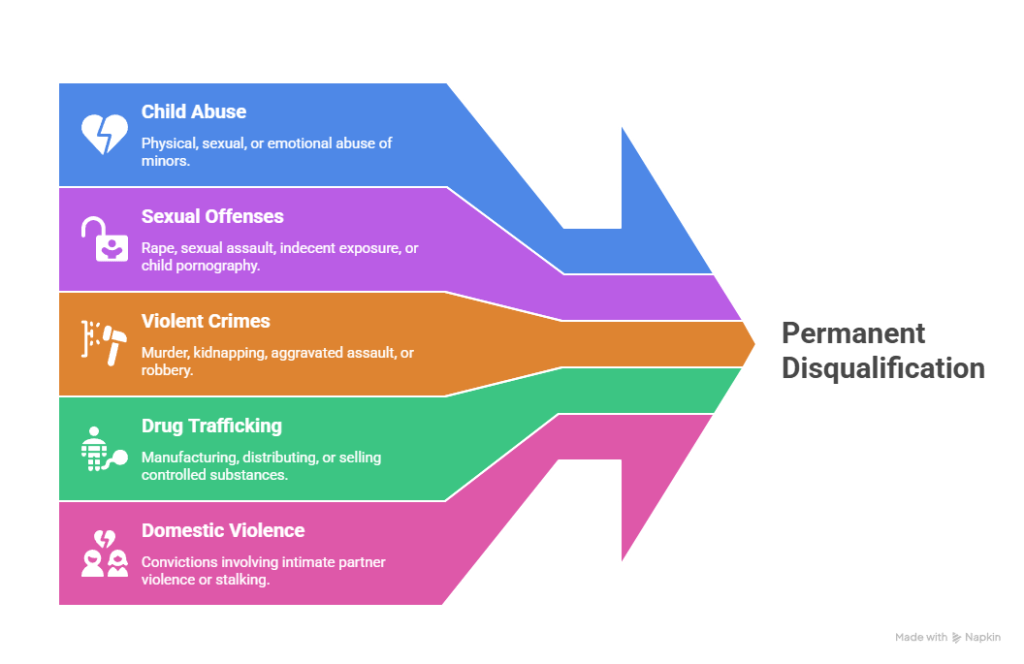 Permanent disqualifying offenses include child abuse or neglect, sexual crimes, violent felonies like murder or kidnapping, drug trafficking charges, and domestic violence convictions. These restrictions apply to both Pennsylvania convictions and equivalent out-of-state offenses identified through FBI background checks.