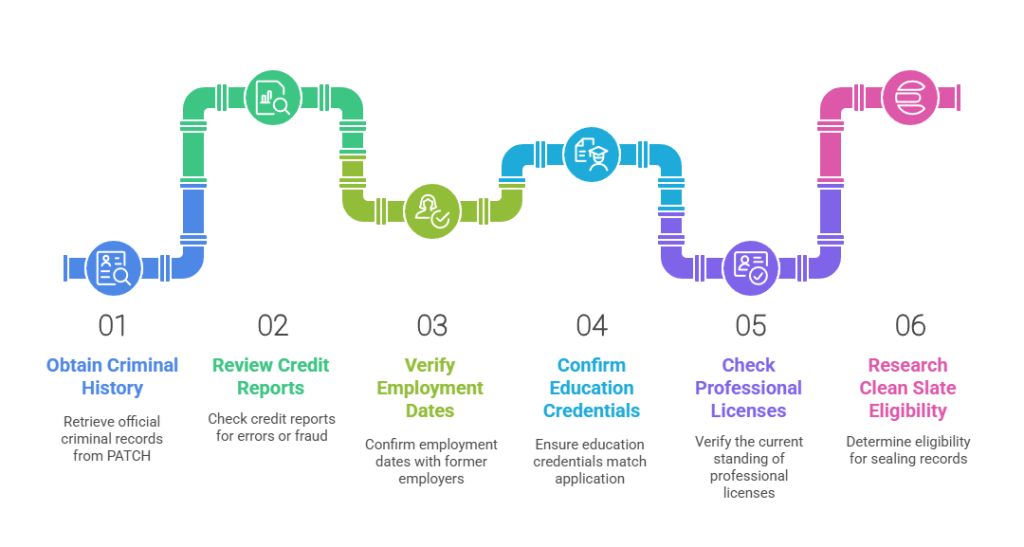 Request your Pennsylvania criminal history through the Pennsylvania Access to Criminal History (PATCH) system, which provides official state police records for a fee. Obtain free annual credit reports from all three major credit bureaus through AnnualCreditReport.com. Verify employment dates with former employers and confirm education credentials with degree-granting institutions. Proactively identifying and addressing issues before employer screening significantly improves hiring outcomes.