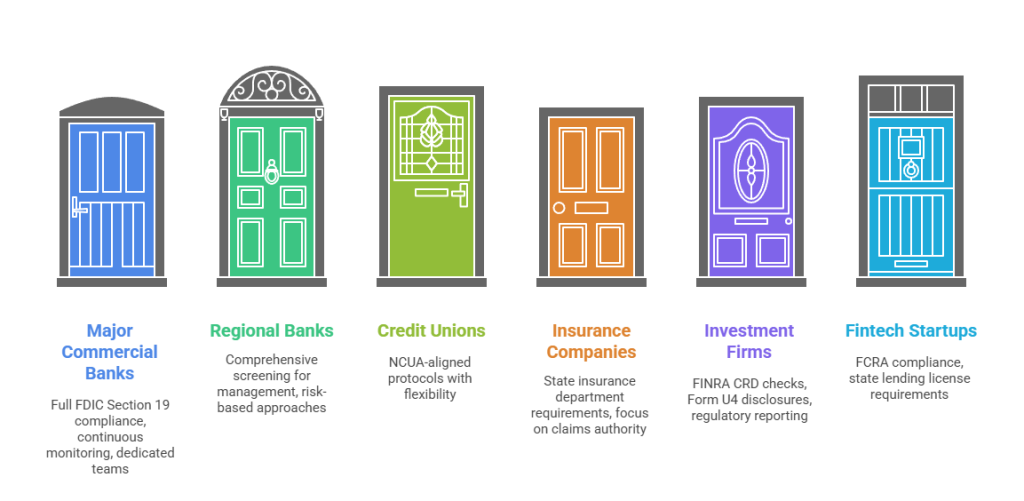 - Major commercial banks: Full FDIC Section 19 compliance, continuous monitoring systems, dedicated compliance teams